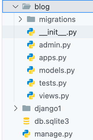 Within the ‘startproject’ you created above you will now need to create a ‘Django App’. This is the application you will be working on throughout your project or application you want to create. The application or project can be a Blog Website, ToDo List Website, etc. HERE IS THE LOOK OF THE DJANGO APP CREATED: